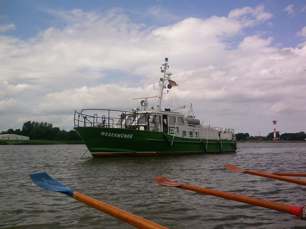 Das Bremer Blockland ist der größte (nach Fläche) und zugleich kleinste (nach Einwohnern) Bremer Stadtteil. Weite Teile sind für den Kfz-Verkehr gesperrt, so dass die Gaststätte Dammsiel zu Lande ein beliebtes Ziel für Radtouren ist. Hier können wir ganz entspannt unter Bäumen sitzen und Essen und Trinken bei sonnigem Wetter genießen. Ein zu früher Aufbruch würde bedeuten, gegen die Strömung zurück zu rudern. Als wir wieder in den Booten sitzen, spüren wir anfangs noch eine leichte Gegenströmung. Dann kippt die Tide und hilft uns zurück nach Vegesack. Der stellenweise starke Gegenwind hält uns nicht davon ab, bis zur Mündung zu rudern, wo wir unserer Unterkunft einen wasserseitigen Besuch abstatten.
