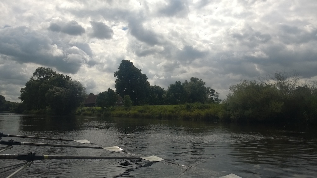 Die erste Rudertour stellt uns vor die Aufgabe, einen Fluss auf seiner gesamten Länge zu berudern, und das gleich zwei Mal. Zum Glück ist die Lesum nur knapp 10 Kilometer lang, bevor sie in die Weser fließt. Dank der freundlichen Unterstützung des Vegesacker RV stehen uns zwei gesteuerte C-Vierer zur Verfügung, mit denen wir die Lesum aufwärts rudern. Bei auflaufendem Wasser haben wir bald den Zusammenfluss aus Hamme und Wümme und damit den Beginn der Lesum erreicht. In den Vorjahren waren wir bereits auf der Hamme unterwegs und befahren sie auch dieses Mal auf einem kurzen Stück. Bald geht es aber auf der Wümme weiter zu unserem Pausenziel, der Gaststätte Dammsiel mit schön gelegenem Biergarten. Wir machen die Boote fest und haben kurze Zeit später das erste, wohlverdiente Getränk vor uns stehen.