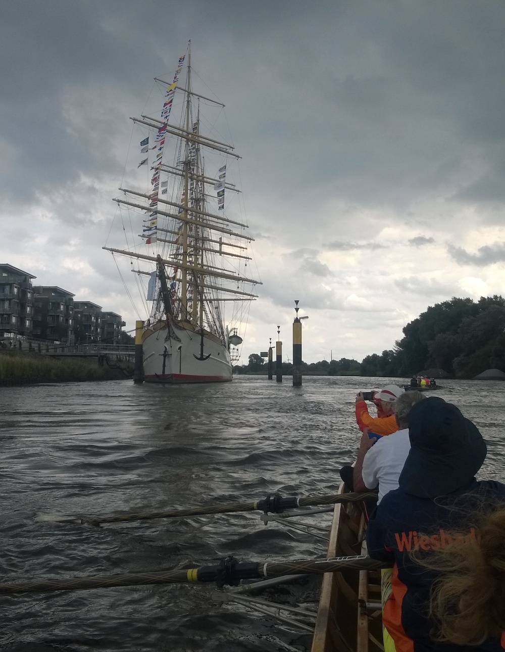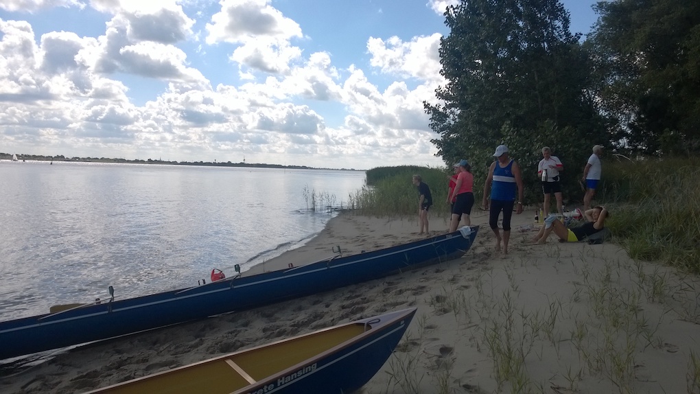 Bei Windstärken um 4 bis 5 Beaufort haben wir auf der Unterweser stellenweise mit Wellen zu kämpfen. Auf der Schweiburg, dem Weser-Nebenarm zwischen Strohauser Plate und Wesermarsch, ist das Wasser wie üblich ruhig und die Boote erreichen rechtzeitig den Wendepunkt kurz vor Brake. Die schilfbestandenen Ufer kommen immer näher; dann sind wir wieder auf der Weser. Zurück am Bootshaus des Nordenhamer RC warten schon Grillgut und das wie immer großartige Kuchenbuffet auf uns.