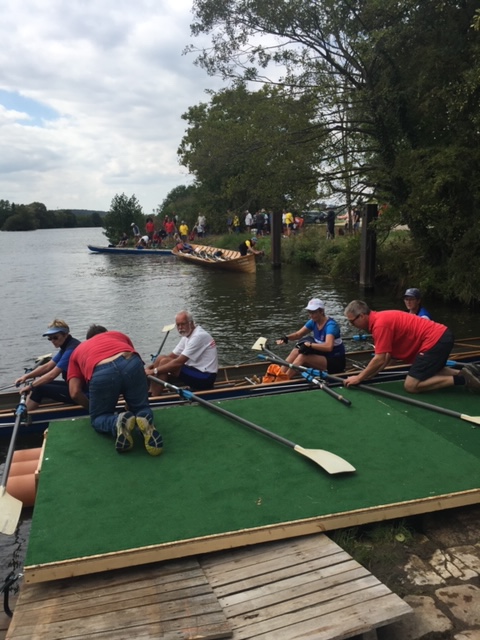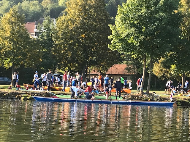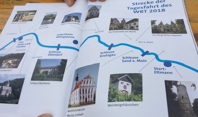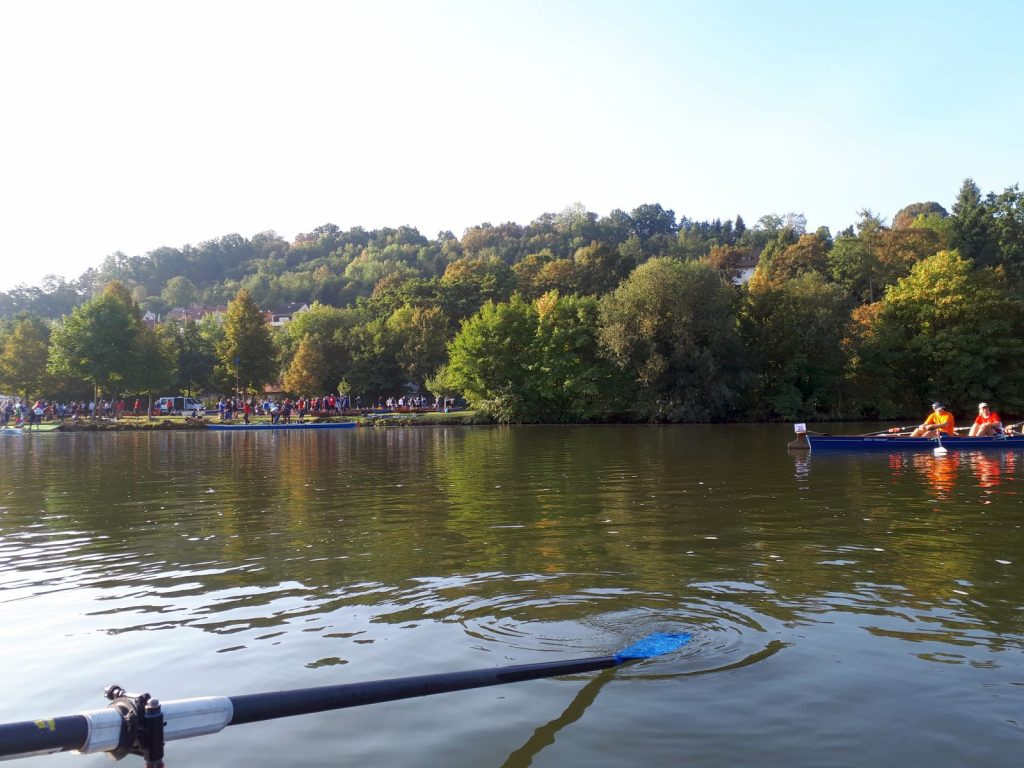 Der Samstag begann wie bei vielen Wanderfahrten mit recht frühem Aufstehen. Ab 6 Uhr gab es Frühstück; gegen 7:20 Uhr fuhren die Shuttle-Busse uns zum Startpunkt nach Eltmann. Dort galt es dann, über 30 Boote aufs Wasser zu bringen, was sehr gut funktioniert hat. Landschaft und Wetter boten den richtigen Rahmen für eine schöne Wanderfahrt. Unsere bunt zusammengewürfelte Mannschaft – in meinem Fall bestehend aus Ruderinnen aus Regensburg und Bernburg, Ruderern aus Bremervörde und Worms sowie einem erfahrenen Stuttgarter Steuermann – harmonierte vom ersten Schlag an sehr gut.