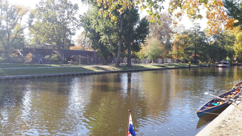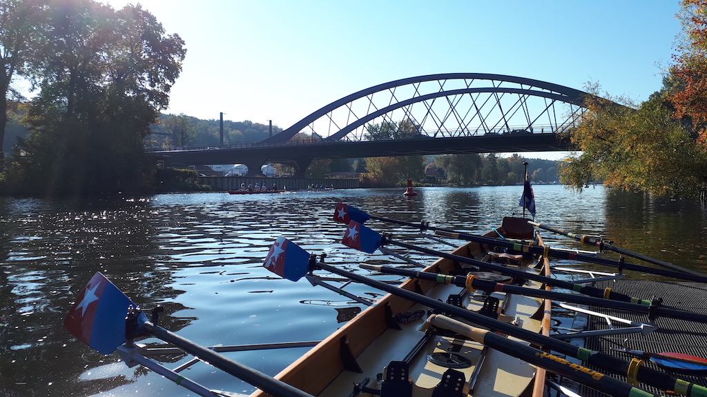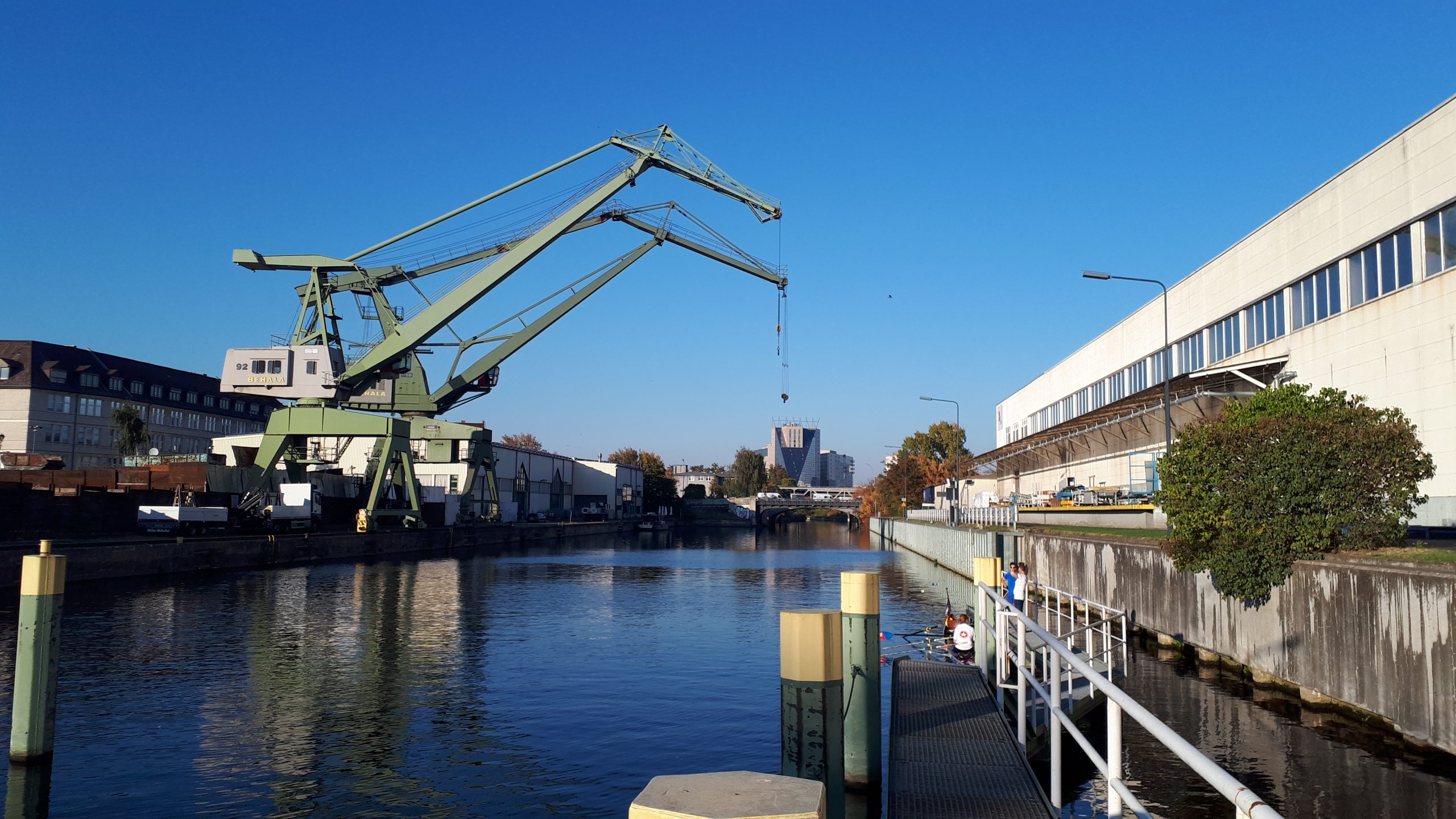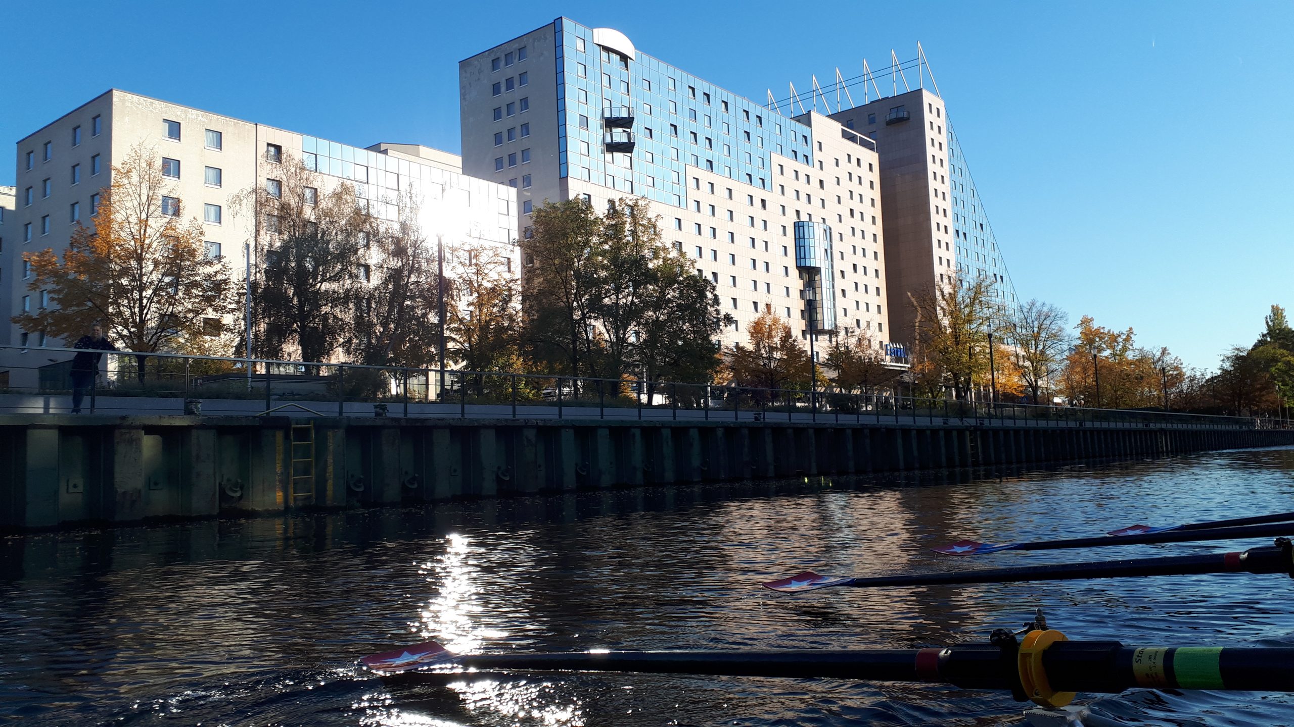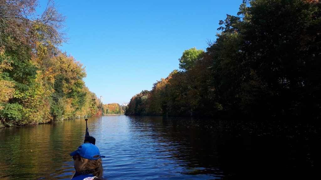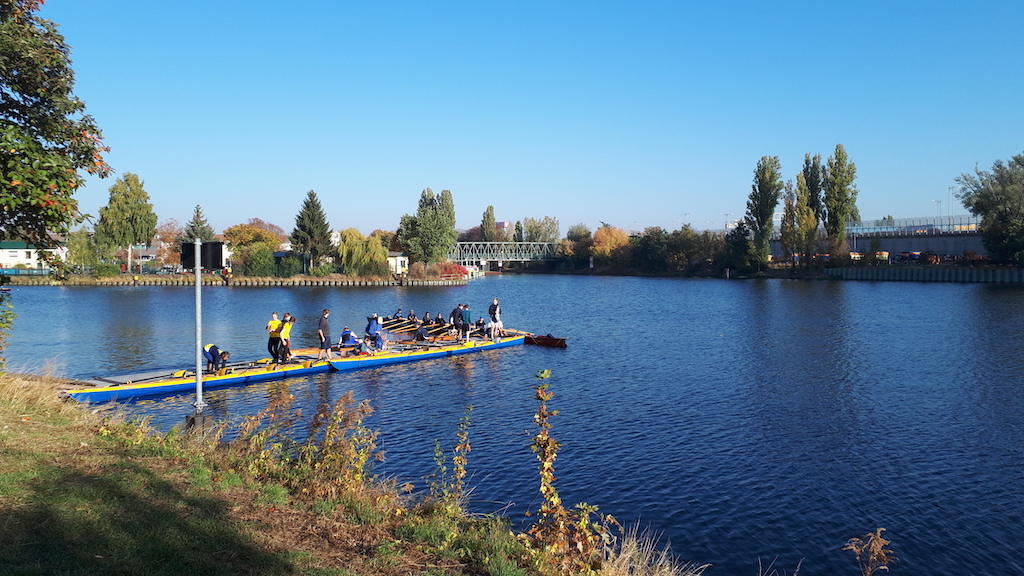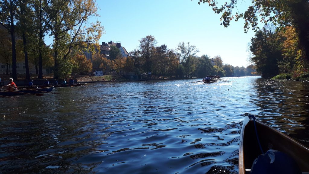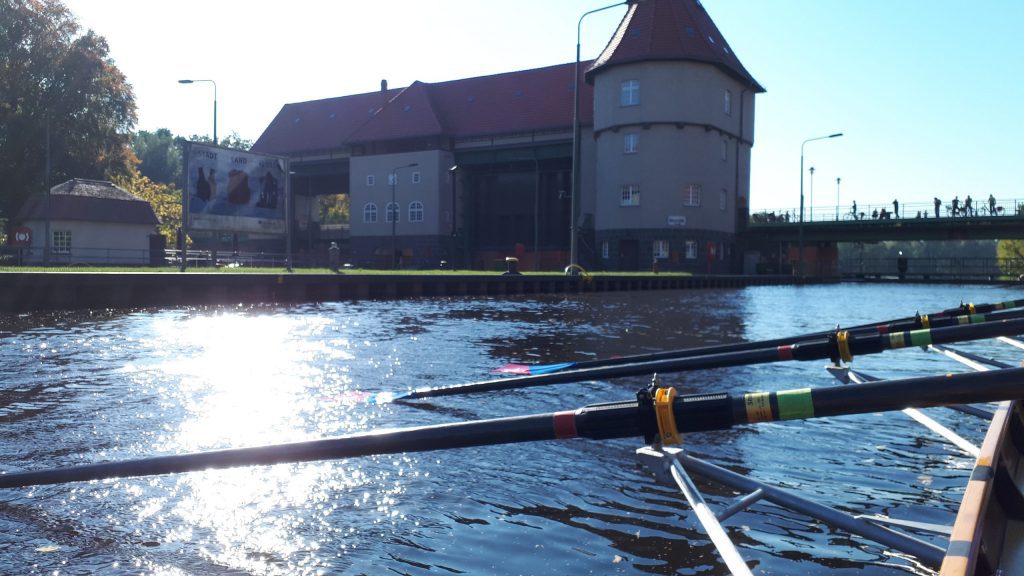 Am nächsten Morgen treffen wir uns an den Booten, um uns auf den Rückweg zu machen. Angesichts der vielen Mannschaften, die alle gleichzeitig aufs Wasser wollen und mit ihren Booten Schlange stehen, ist davon auszugehen, dass es wohl einige Zeit dauern wird, bis es losgehen kann. Tatsächlich sind wir nach etwa 30 Minuten auf dem Wasser und rudern auf dem Teltowkanal. Schon bald passieren wir – ohne den genauen Punkt zu kennen – den Ort, an dem Chris Gueffroy 1989 gestorben ist. Er war der letzte DDR-Bürger, der den Versuch einer Flucht in den Westen mit seinem Leben bezahlen musste.