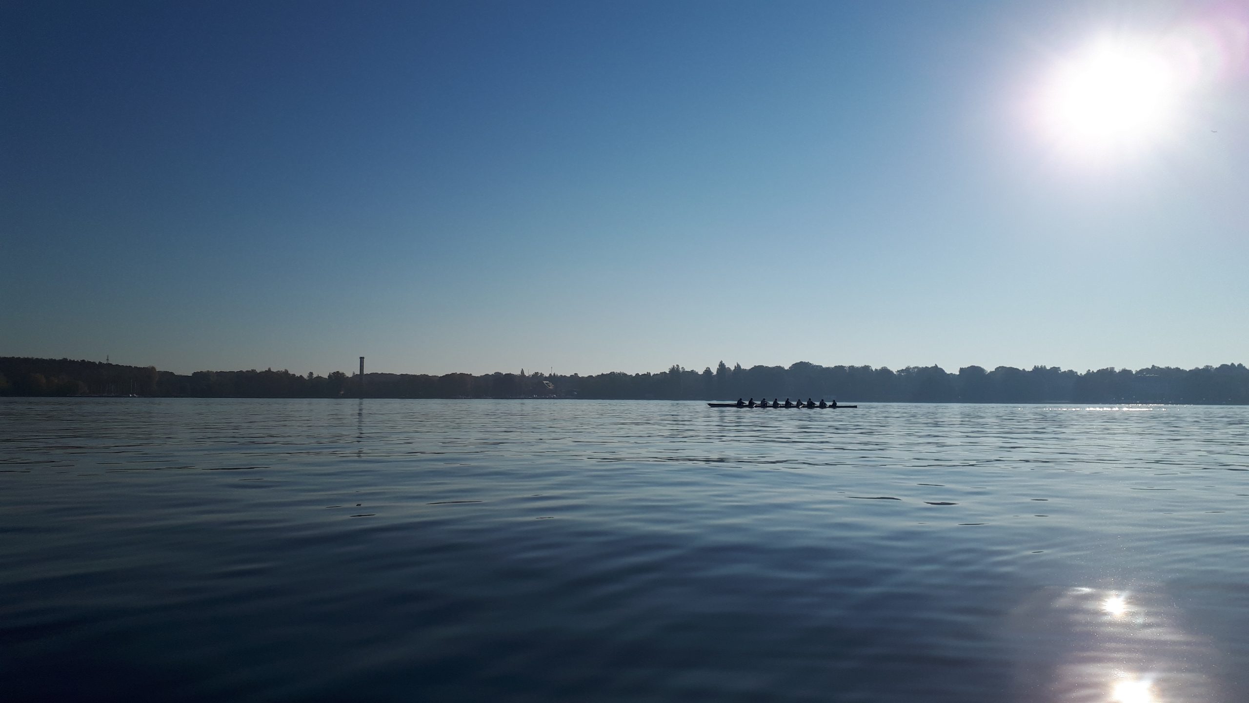 Auf den letzten Kilometern rudern wir der untergehenden Sonne entgegen. Die villenbestandenen Seeufer auf der Verbindung zwischen Teltowkanal und Großem Wannsee sind ein abschließendes Highlight, bevor wir eine Stunde vor Sonnenuntergang am Steg des BRC Welle-Poseidon anlegen.