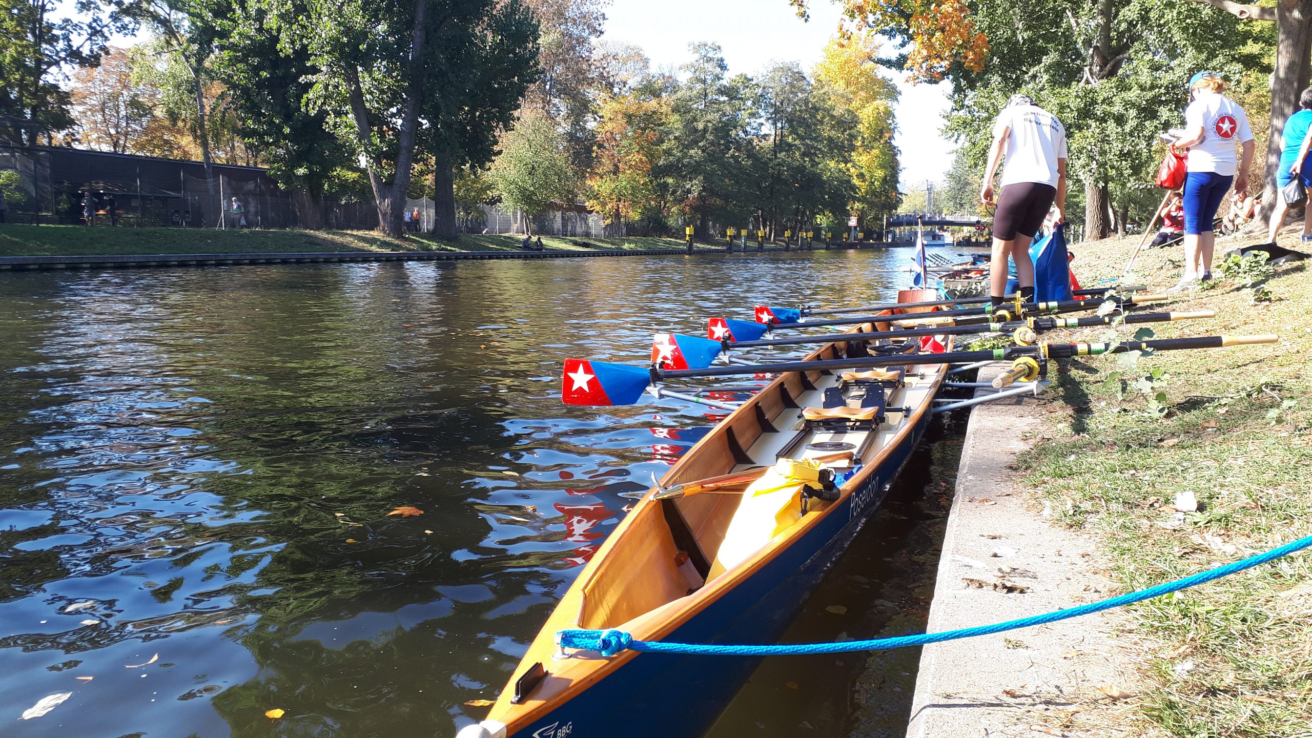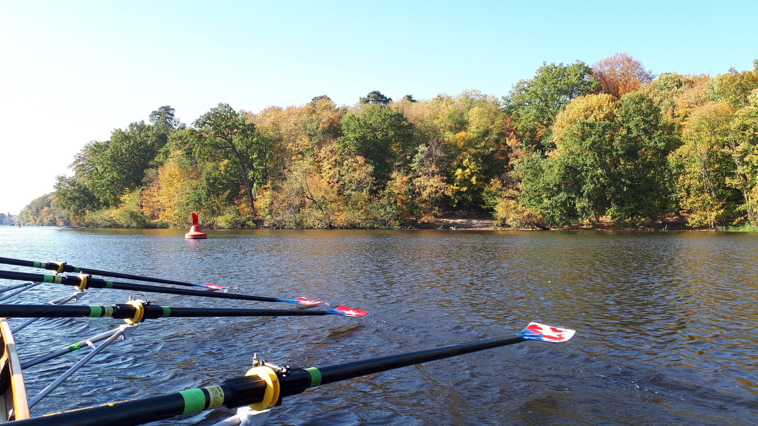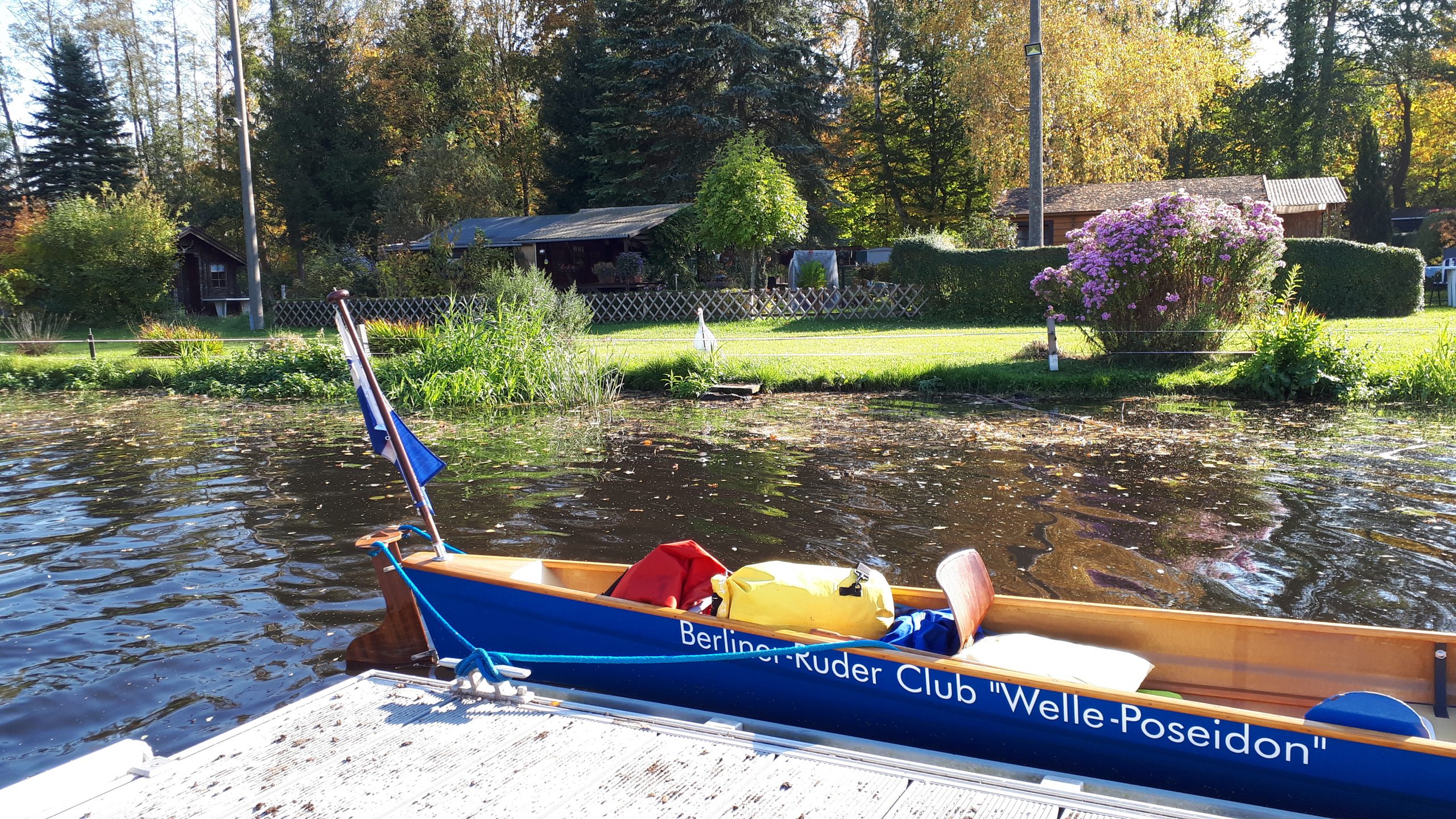 Besser kann man sich einen Goldenen Oktober nicht vorstellen als wir ihn heute erleben. Die Ufer des Teltowkanals sind fast durchgehend von herbstlich gefärbten Bäumen bestanden, während wir unter einem strahlend blauen Himmel rudern und die Sonne angenehm und teils kräftig scheint. Wir erreichen und passieren die Schleuse Kleinmachnow. Im Unterwasser legen wir an. Hier führt unser Fahrtenleiter Andreas uns zum Griechen, wo wir reichlich essen (obwohl eigentlich kleine Portionen bestellt waren).