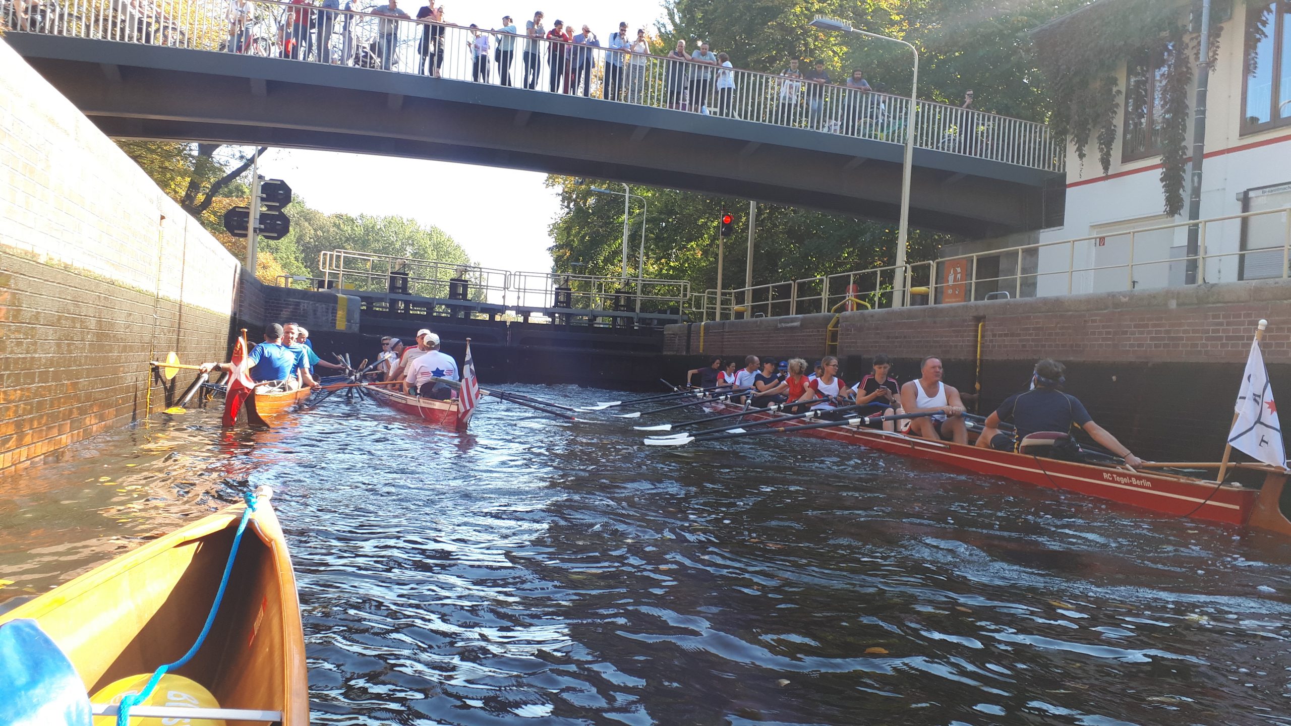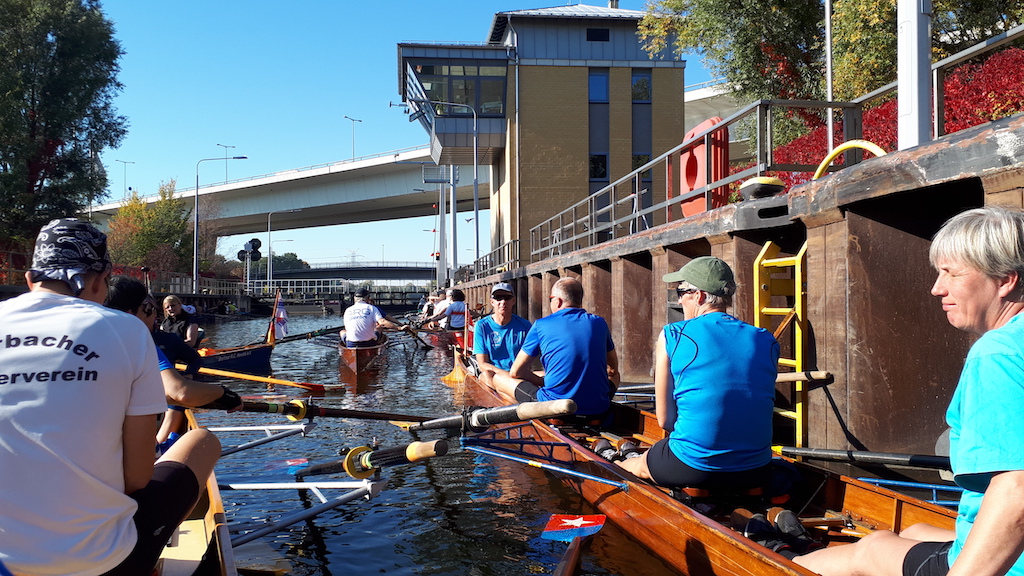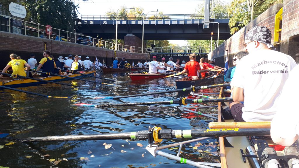 Unterwegs sieht man zwar nur vereinzelte Boote; in den Schleusen wird es aber jedes Mal sehr voll. Hier wird erst deutlich, wie viele Ruderer an diesem Tag unterwegs sind. Die erste Schleuse erreichen wir übrigens nach einigen Kilometern auf der Spree in Charlottenburg. Die Schleusung läuft problemlos. Neben uns liegt ein Boot mit dänischen Ruderern, die bereits seit 40 Jahren teilnehmen.