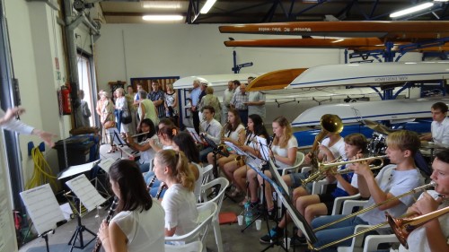Nach einem sonnig heißen Vortag hingen Wolken am Himmel, als der WRC sein traditionelles „Frühstück der Ruder“ am Rhein feierte. Zuvor konnten – wie bereits schon im vergangenen Jahr - neue Boote getauft werden. Diesmal waren es drei Rennboote, die vor der Bootshalle auf dem Clubgelände am Rhein in Worms für die feierliche Bootstaufe geschmückt worden waren. Den musikalischen Rahmen gestaltete das Jugendorchester „Harmotones“ vom Musikverein Harmonie Herrnsheim unter der Leitung von Benedikt Rosmanith.