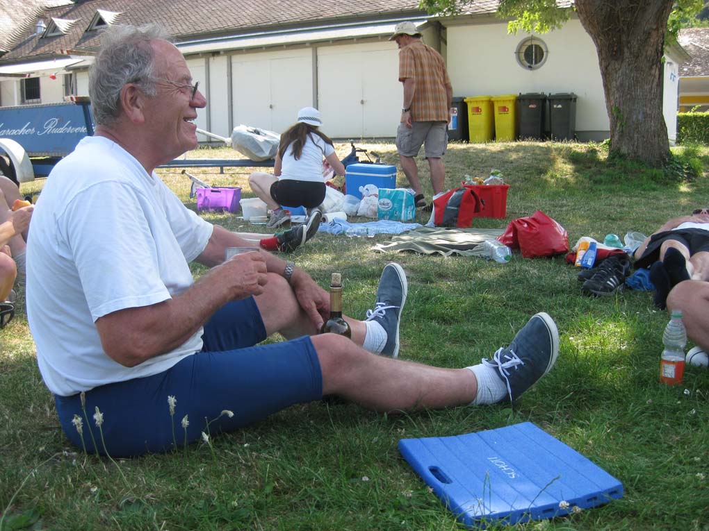 Wie immer hieß es zur Mittagspause "Fertigmachen und Schuhe aus". Diesmal legten wir aber nicht in Oppenheim sondern in Langenau an. Eine gute Idee, denn im Hofgut Langenau Trebur, kurz hinter Nackenheim, gab es frische Bratwurst, Forelle blau, Steak, Kartoffelsalat und alles andere, was das Ruderherz begehrte.