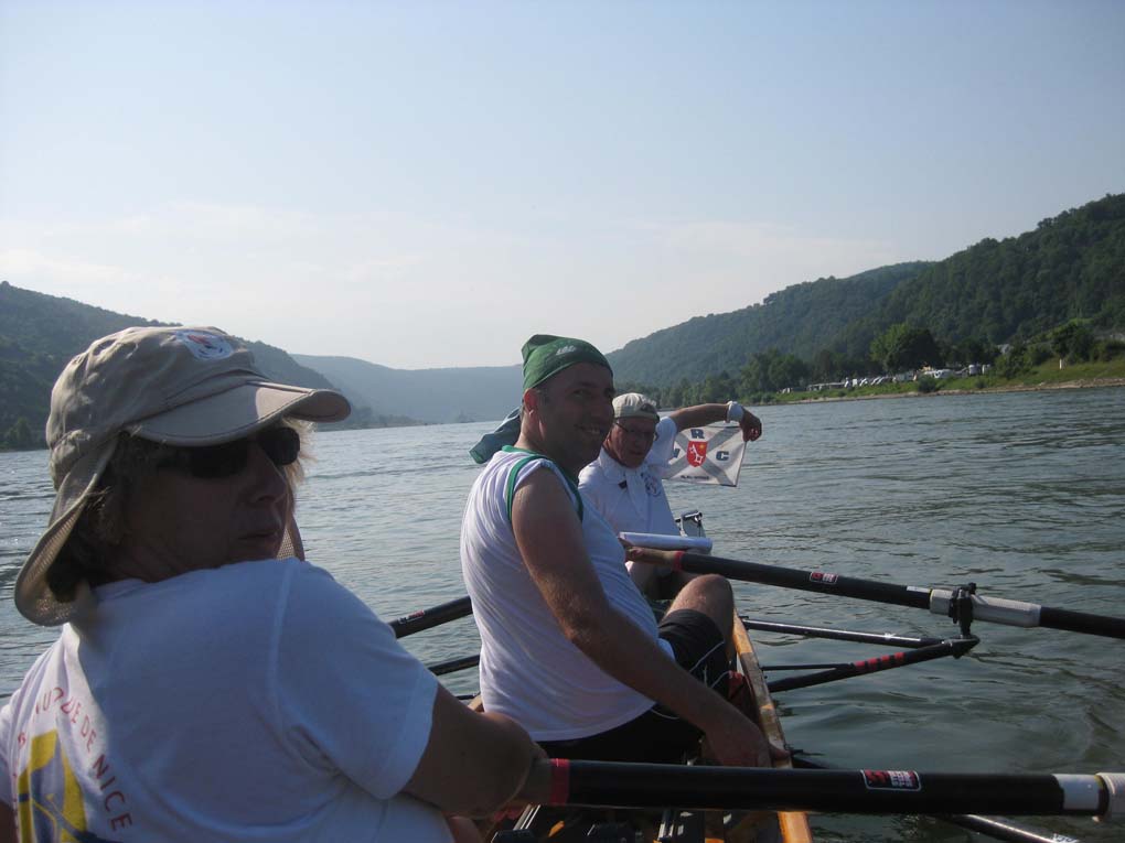 Am nächsten Morgen hieß es wieder früh aufstehen, denn um 10:00 Uhr war Einteilung sowie Beladung der Boote und der Minna in Mainz. Insgesamt waren wir mit drei Vierern unterwegs. Nachdem wir die Boote pünktlich eingesetzt hatten, ging es vorbei an Ingelheim und Bingen zum ersten Stopp nach Bacharach (RV Bacharach). Mittagspause war angesagt. - Es war eine trockene Station, denn keinem von uns gelang es, vom Gastwirt des RV ein kühles Getränk zu ordern. – Aber wir waren ja gut gerüstet und ließen uns nicht entmutigen.