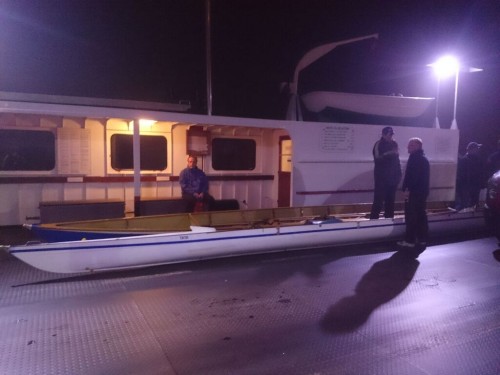 Aber nachdem sich die ersten größeren Nebellöcher auftaten, konnten wir die Fahrt starten. Leider wurden wir in Höhe Gernsheim wieder vom Nebel eingeholt. So beschlossen die Mannschaften von zwei Booten im Sporthafen von Gernsheim anzulegen. Ein Boot kämpfte sich bis zum nahegelegenen Eicher Loch durch. Hänger und Bus befanden sich in Oppenheim, eine Überfahrt mit Bus und Hänger auf der Fähre nicht war möglich, und dadurch erlebten wir das seltene Ereignis mit Ruderbooten auf der Fähre.