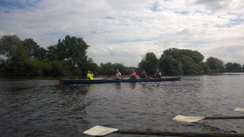 Bei Windstärken um 4 bis 5 Beaufort haben wir auf der Unterweser stellenweise mit Wellen zu kämpfen. Auf der Schweiburg, dem Weser-Nebenarm zwischen Strohauser Plate und Wesermarsch, ist das Wasser wie üblich ruhig und die Boote erreichen rechtzeitig den Wendepunkt kurz vor Brake. Die schilfbestandenen Ufer kommen immer näher; dann sind wir wieder auf der Weser. Zurück am Bootshaus des Nordenhamer RC warten schon Grillgut und das wie immer großartige Kuchenbuffet auf uns.