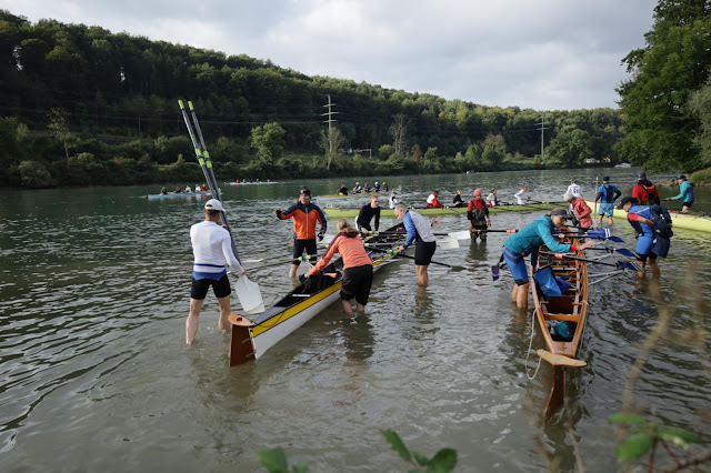 Samstagmorgen dann etwas entspannter: Flussstrecke heißt Start erst um 9:30 Uhr. Frühstück 7 Uhr, Abfahrt 7:45 Uhr, kurz nach 8 Uhr am Regattaplatz. Tatsächlich hätten wir noch die Chance zu den ersten fünf einwassernden Booten zu gehören (dann gibt es einen Getränke- und Essensgutschein), aber angesichts der niedrigen Temperaturen entscheiden wir uns dagegen. Einwassern gelingt problemlos, um 9:15 Uhr sind wir draußen. Bei der Flussstrecke werden die Boote in Segmente A/B/C eingeteilt. Gig-Vierer sollen eigentlich nach hinten, aber wir haben ja ein bisschen was vor und mit unserem 9. Platz in der Gesamtwertung 2022 auf der Flussstrecke sollten wir nicht zu weit hinten starten. Die Rennvierer, die sich daran stören, machen wir in der Regel auf den ersten 500 m klar... Der Mannheimer Vierer liegt ganz in der Nähe bei uns.