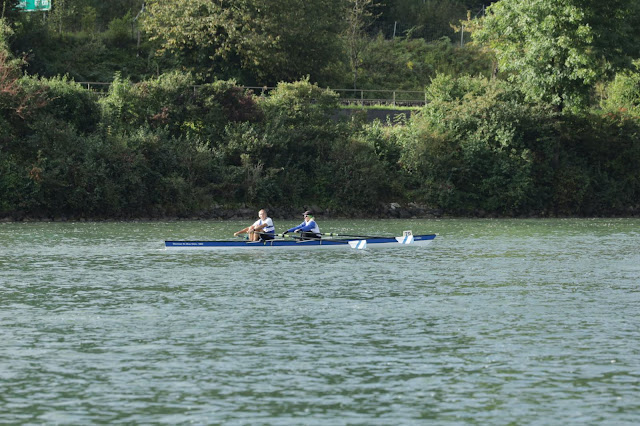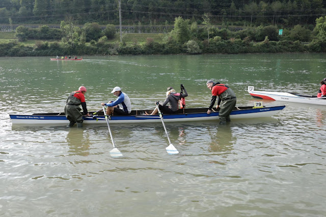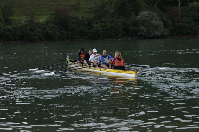9:30 Uhr Startschuss! Im Massenstart geht es los und wir kämpfen uns durch die Masse. Wir haben doch einige Boote zu überholen, so dass wir Teile der ersten zwei Kilometer mittig in der recht starken Strömung rudern müssen. Im Nachhinein stellen wir fest, dass wir da wohl einiges an Rückstand auf den Mannheimer Vierer kassieren. Das Feld zieht sich langsam auseinander und es entwickeln sich einige Bord-an-Bord-Kämpfe, die wir alle aber für uns entscheiden (alte Rudererweisheit "immer 10 Dicke mehr als der Gegner"). So ein überholter Achter macht einfach Laune. Sabine kommt auch immer besser in die Kampflinie und steuert sehr stark durch die Kurven, in denen sich die unterschiedliche Strömung stark bemerkbar macht. Von Mannheim keine Spur, bisschen besorgniserregend, aber unser Coach Bani ist am Ufer unterwegs uns ruft uns den Rückstand zu. Den verstehen wir aber (zum Glück?) nicht so gut. Also konzentrieren wir uns auf unseren Schlag und einfach auf alles, was da so vor uns kreucht. Hinter uns sehen wir den Mannheimer Doppelachter, den wir auch immer besser in Schach halten - gutes Zeichen. Vor der Wende sehr starke Strömung, aber wir kommen weiter gut in den Rhythmus. Vor uns fährt ein Gig 4x+, auf den wir stark auflaufen, das muss Mannheim sein. Kurz vor der Wende schießt Mannheim aber schon in der Gegenrichtung an uns vorbei, huch? Es stellt sich heraus, dass direkt vor uns noch ein Boot (4x+) aus Zürich rudert. Das bleibt auch vor uns an der Wende. Die gelingt uns gut und es geht auf den wilden Ritt zurück nach Solothurn. Tja, und nun? Unter den Top 7 sind wir (super), aber noch zwei Gig 4x+ vor uns, darunter Mannheim mit geschätzt 1:30 min vor uns - bei noch 18 km zu Rudern.