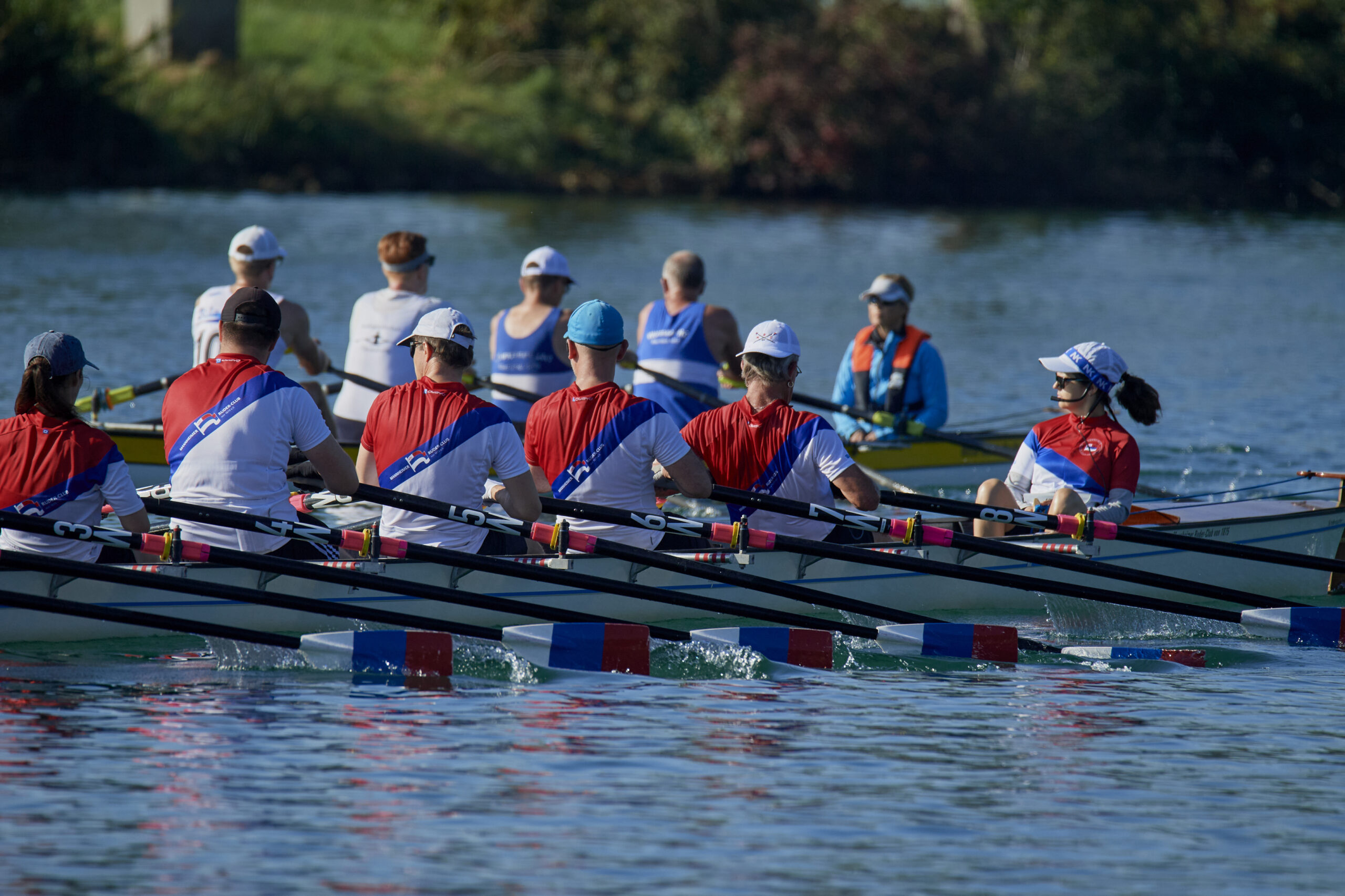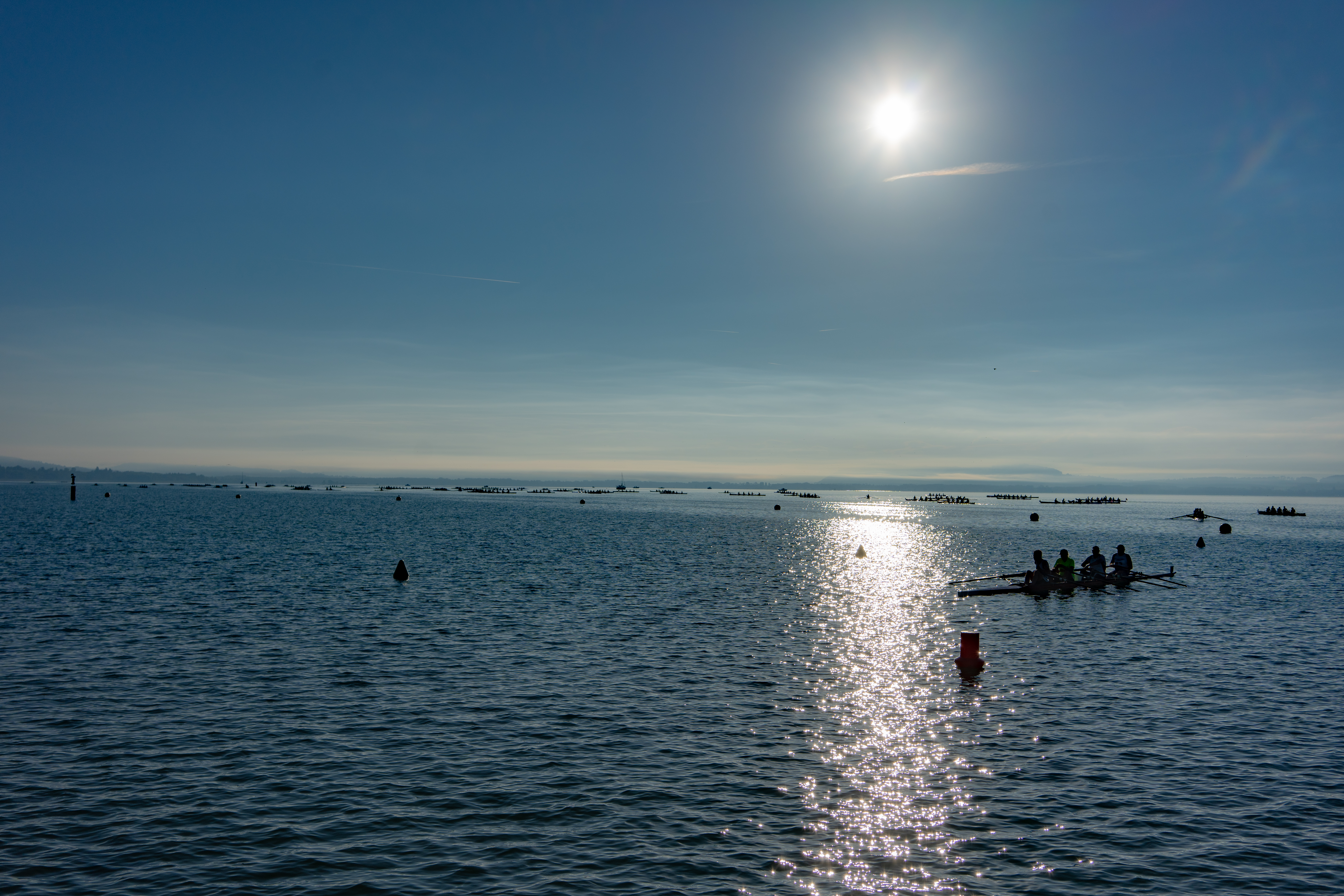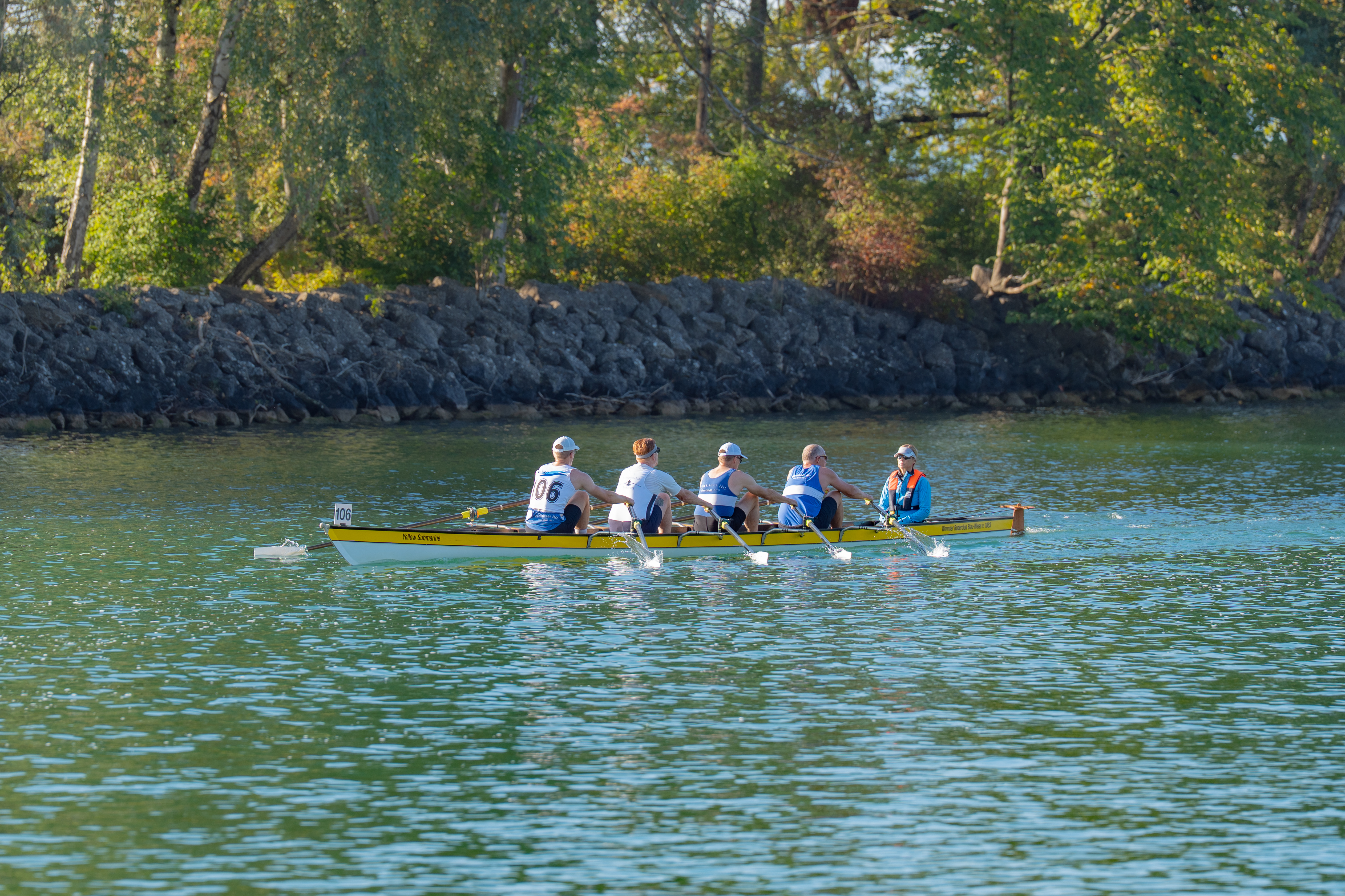 So kämpfen wir uns ins Ziel, das ein bisschen überraschend kommt, da wir die Verkürzung nicht so genau abschätzen konnten. Das war anstrengend, aber ein weiterer Vorteil der Seestrecke sind die vorhandenen Stege und vielen Helfer, die das Auswassern doch sehr erleichtern. Abriggern, Abtrocknen und drohende Unterhopfung bekämpfen heisst es nun. Siegerehrung ist um 14 Uhr. Immer ein bisschen spannend, ob sich nicht doch noch irgendwo ein weiterer Gig Doppelvierer vrobeigemogelt hat, aber es stellt sich heraus: zum sechsten Mal gewinnen wir den Ehrenpreis für den schnellsten 4x+ Gig. Beim sich ähnelnden Ehrenpreis stellt sich die leicht wechselnde Bootsbesatzung als Vorteil heraus - so darf jeder mal einen mitnehmen. Dieses Jahr geht er natürlich an Jonas, der sich dankenswerterweise kurzfristig bereit erklärt hat, mit den alten Männern zu rudern, nach dem Klaus leider verletzungsbedingt absagen musste. Der Doppelfünfer schneidet ebenfalls mit einer sehr guten Zeit und einer sehr guten Platzierung in der vorderen Hälfte des Feldes (113 Boote sind ins Ziel gekommen) ab.