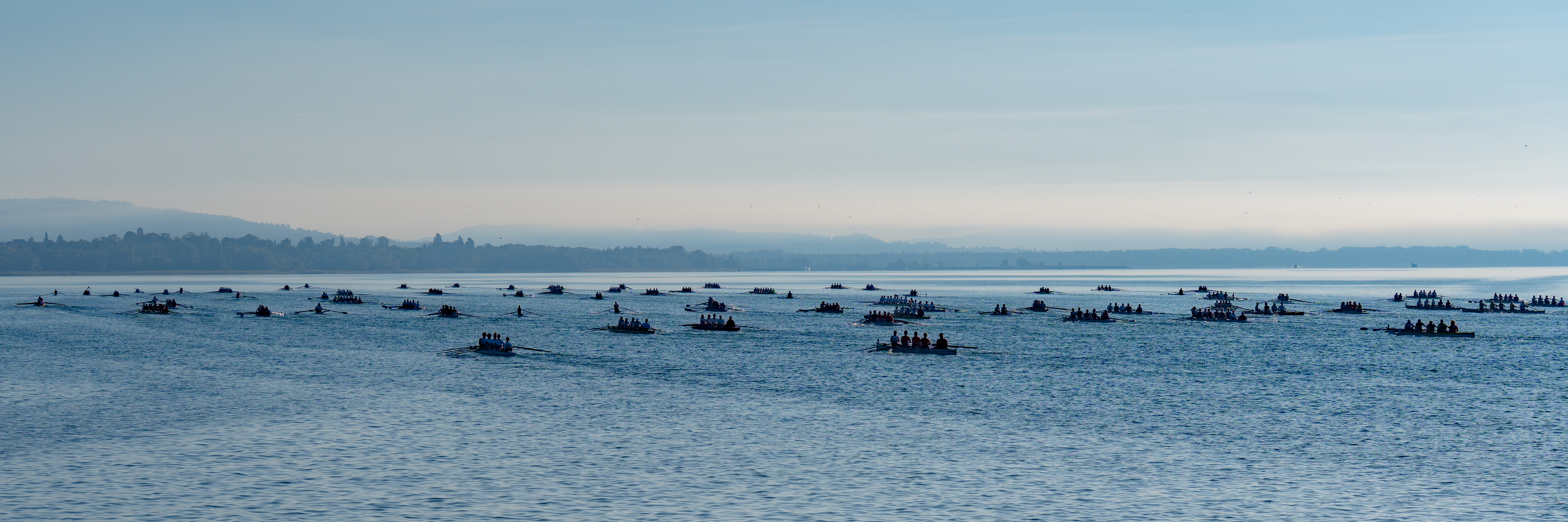 Neuer Teilnehmerrekord bei der Bilac: das schöne Wetter zog über 110 Boote an, viele Kleinboote sind am Start, darunter auch 3 Kanus und (sehr beeindruckend) ein Zweier Ohne. Der Start liegt dieses Mal etwas näher am Ziel, so dass sich die Strecke gegenüber der "Original Seestrecke" etwas verkürzt auf knapp unter 30 km. Zudem gibt es nun auch hier sogenannte Startblöcke, in die die Boote einsortiert werden. Da halten wir uns vielleicht etwas zu sklavisch dran, aber auf der anderen Seite macht es immer Riesenlaune an vielen Booten vorbei zu ziehen - echtes Regatta Feeling kommt auf.